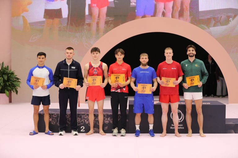 Foto: Federação de Ginástica de Portugal (Vasco Peso ocupa a primeira posição do lado direito)